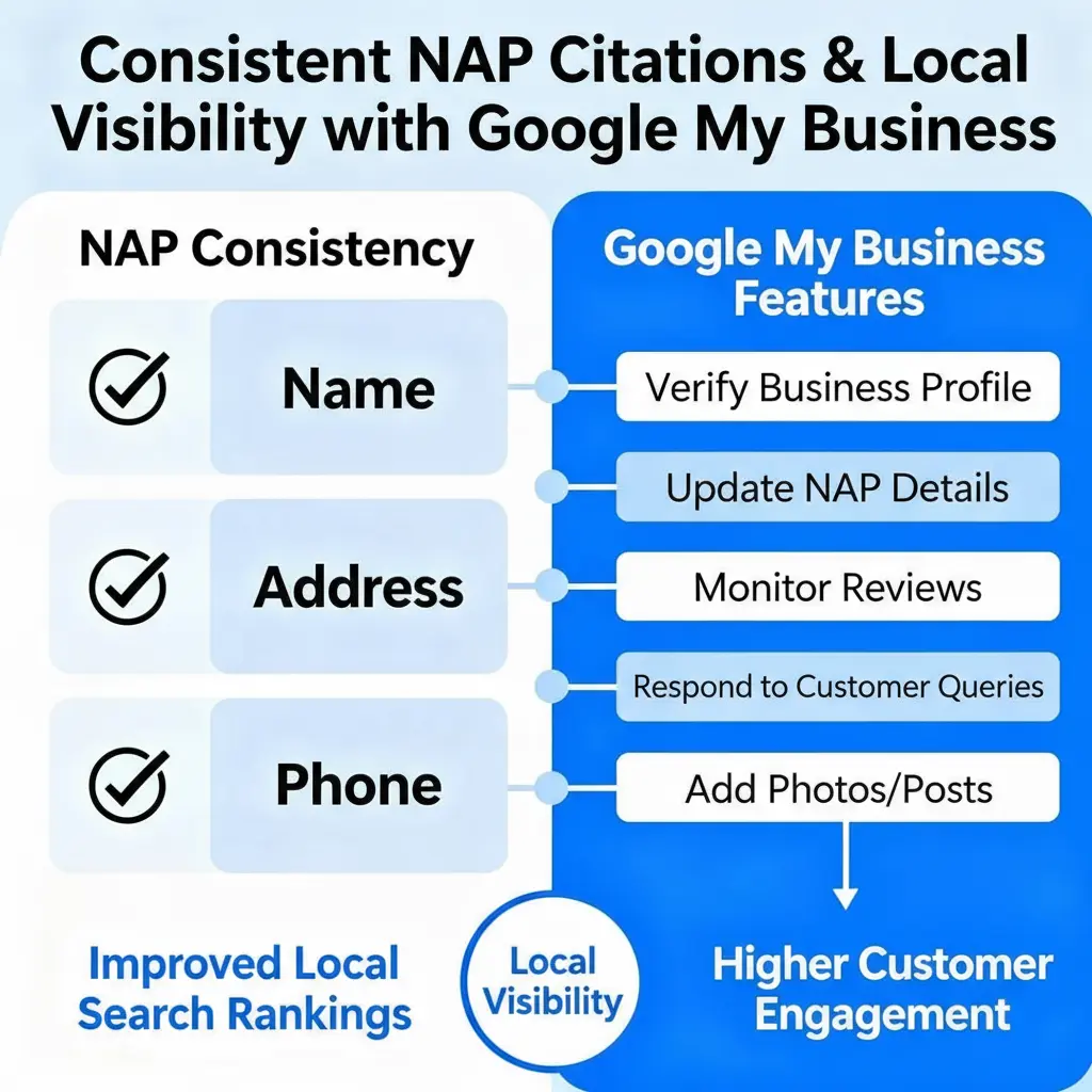 In order to serve local Search Engine Optimization, NAP consistency must be maintained. Ensure that the name, address, and phone number of your business are consistent everywhere so that Google can easily confirm the legitimacy of your organization, which in turn increases your ranking and helps increase customer trust in your local search results.
